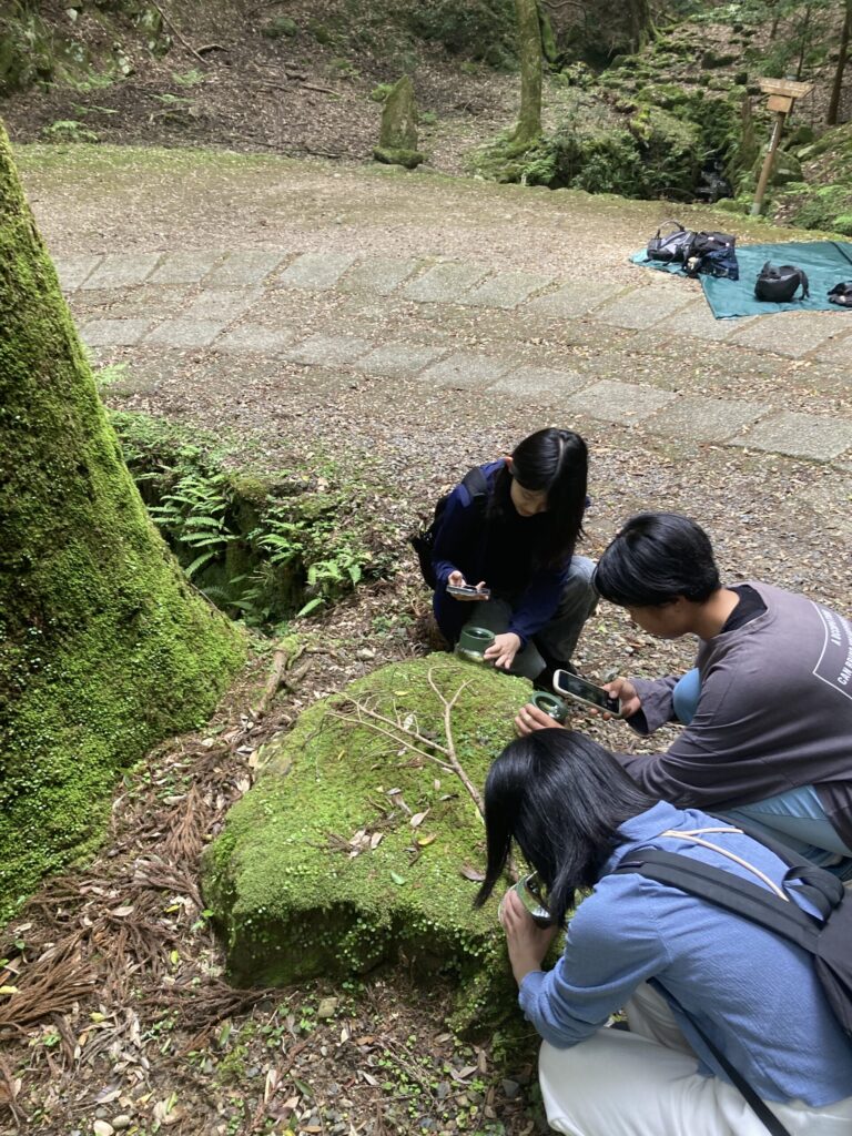 次に、五感を使って1300年守られた自然を体感したり、ルーペで見える自然の世界を女子大附属の生徒と一緒に楽しみました。「苔がかわいい」「春日山を歩くととっても気持ちいい」と感想を伝えながら古道を進みました。