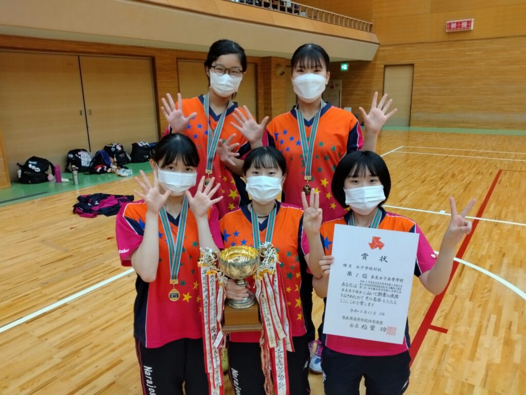 学校対抗の部では1次リーグで橿原高校・奈良高校にいずれも3-0で勝利。準決勝では香芝高校に3-1、決勝では生駒高校に3-0で勝利して優勝と近畿大会出場を決めました。5人全員がそれぞれの持ち味を生かしてチームに貢献できたと思います。(県代表枠は8校)