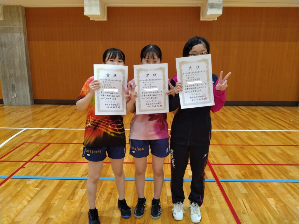 112名がエントリーした女子の部では、5名全員がベスト8に勝ち残りました。特に、第9シードの本校選手がランキングポイントを争う第8シード選手(帝塚山)との直接対決に勝利、高校の大会では初のベスト8入りを果たしました。