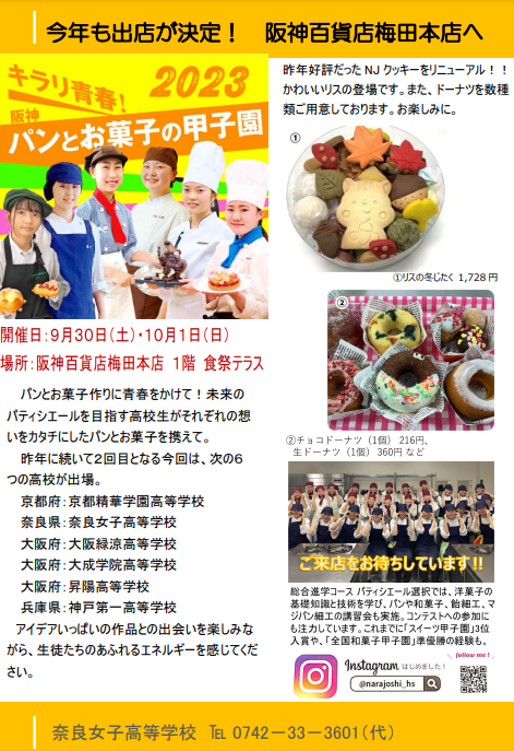 Topics トピックス パンとお菓子の甲子園(阪神百貨店)に出店します! 2023.9.26 #コース活動, #学校生活 今年も奈良女子パティシエールコースの生徒たちが、阪神百貨店に出店します。 ご来店お待ちしております! アニメーション部デザイン 天平祭キャラクターが完成しました! 【卓球部】大会結果(2023年9月17日) 関連記事 2026.03.12 「AERA」3月12日号に本校の取り組みが紹介されました!! 2026.02.18 卒業式 2026.02.02 探求プロジェクトの成果発表 (大和みらいカップ) 2025.11.29 1年生の探究授業の様子が奈良テレビ放送で紹介されました! 2025.11.20 第2回道徳教育パワーアップ研究協議会