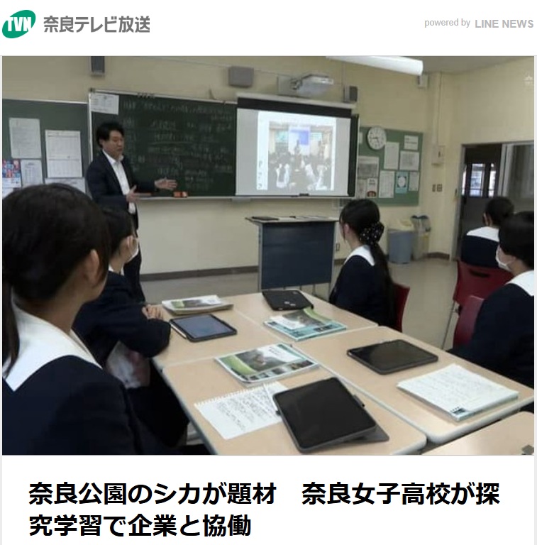 奈良テレビ放送で、本校が企業と連携しながら取り組んでいる奈良公園の鹿を題材にした探究活動の様子が紹介されました。奈良女子高校では、探究活動を通して社会の課題を学び、解決するための方法を考え実践しています。