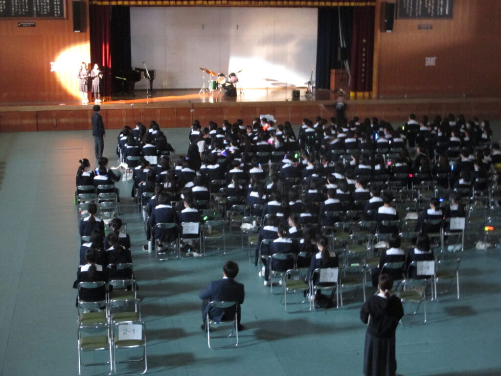 Topics トピックス 新入生歓迎会 2024.4.30 #学校生活 4月27日(土)、新1年生を迎えて、生徒会が主体となり、体育館にて「新入生歓迎会」が催されました。新入生は拍手で迎えられ、生徒会長の挨拶の後、各部活動の紹介に始まり、生徒会の企画や先生紹介などがありました。 積極的にクラブ活動に参加をして、ぜひ充実した学校生活を送ってほしいと思います! 生徒×奈良教育大ユネスコ×防災 令和6年度入学式 関連記事 2026.03.12 「AERA」3月12日号に本校の取り組みが紹介されました!! 2026.02.18 卒業式 2025.11.20 第2回道徳教育パワーアップ研究協議会 2025.09.26 【2年造形表現 コラージュ】~保育進学コース~ 2025.09.26 【1年生造形表現 ステンシル、スクラッチ】 ~保育進学コース~