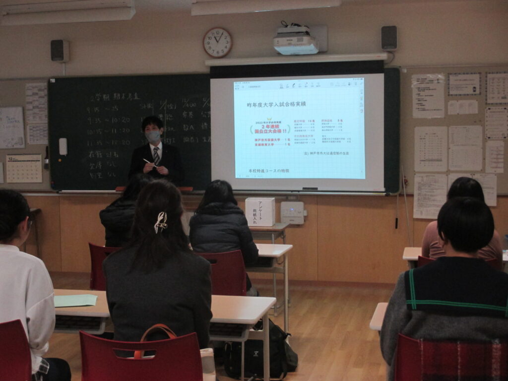 12月2日(土)、本年度第1回目の入試説明会を開催いたしました。試験教科の国語、英語、数学の傾向と対策、勉強の方法など、試験に役立つ内容の説明に、参加者の皆様も真剣に聞かれていました。その後、希望するコースに分かれてコースの特徴や中身の説明を聞いていただき、本校のことをより深く理解していただく機会となりました。