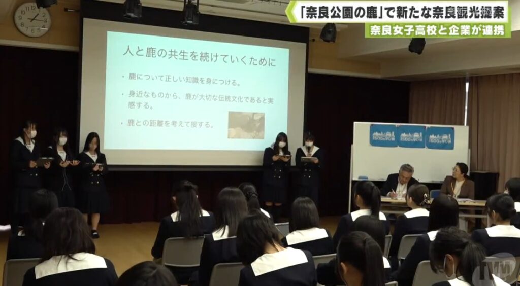 Topics トピックス 1年生の探究授業の様子が奈良テレビ放送で紹介されました! 2025.11.29 #コース活動, #学校行事, #授業, #未分類 11月28日(金)に、本校が企業と連携しながら取り組んでいる、奈良公園の鹿をテーマにした探究活動の成果発表会が行われ、その様子が奈良テレビ放送で紹介されました。 探究活動の様子はコチラ (奈良公園の鹿で新たな奈良観光提案) ⇒(奈良テレビ放送)https://www.youtube.com/watch?v=LRTLmU6UfO8 【卓球部】近畿大会最終日 学校対抗の部は8位 第2回道徳教育パワーアップ研究協議会 関連記事 2026.03.12 「AERA」3月12日号に本校の取り組みが紹介されました!! 2026.02.18 卒業式 2026.02.02 探求プロジェクトの成果発表 (大和みらいカップ) 2026.01.14 第3回道徳教育パワーアップ研究協議会のご案内 2025.12.22 第2回入試説明会